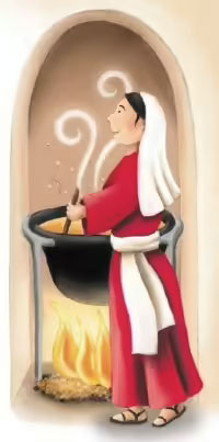 David grew up in the kitchen of the inn. His father was the innkeeper. His mother cooked the food. David's older sisters cleaned the rooms, and his older brother swept the stable. David loved to sing. He would sing to his mother as she cooked the food. David made up songs and banged on pots and bowls as he sang to her. David's mother smiled at him. "Someday you will sing in the temple, my son," his mother said. David grinned at his mother. "Tem-ple," David said very carefully.